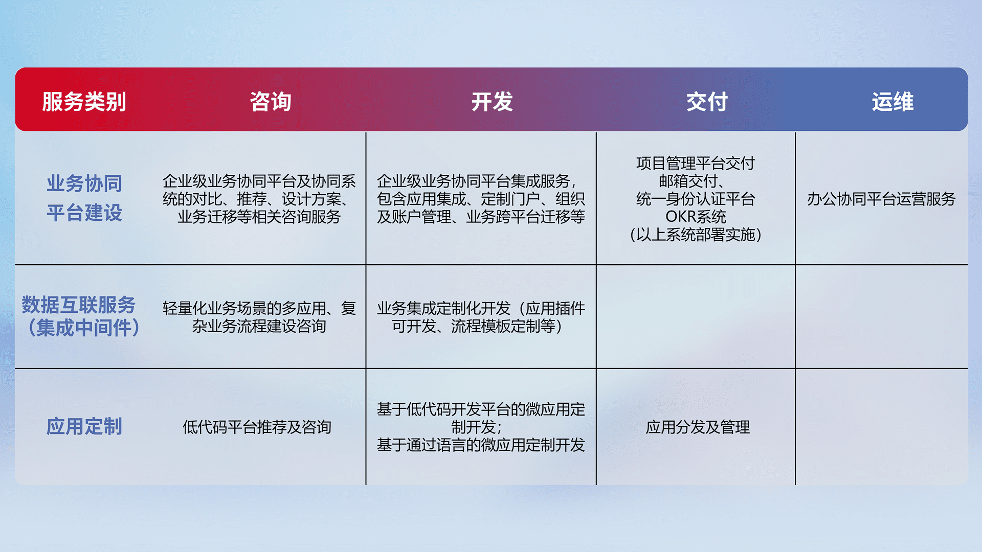 针对钉钉、、、企微、、IDaas等平台级产品提供产品的规划、、方案、、交付、、定制化开发等服务,,,实现如统一协同办公、、、、智能客户服务、、、、混合会议管理、、、智能数据查询、、、等业务场景,,实现数字化转型。。。
