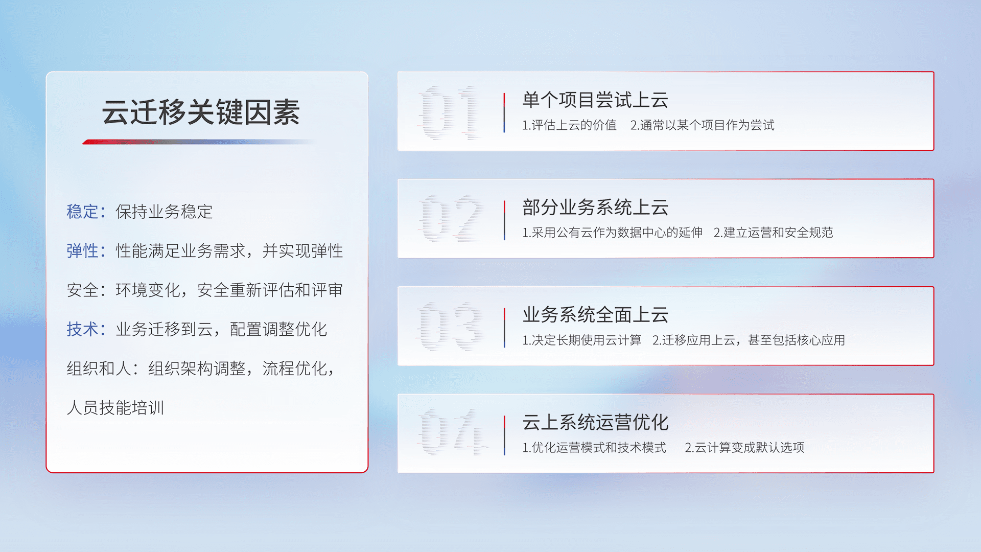 结合实际业务,,从规划设计、、、、云平台选型、、、、云原生改造、、、、数据迁移、、集成交付,,迁移全过程为客户识别最佳上云路径,,,,做好风险识别管理,,设计网络架构、、、身份权限、、、、安全审计合规、、操作审计、、、、日志审计、、监控告警策略、、多站点容灾设计等,,对云上基础设施进行整体规划,,提升IT治理水平,,以满足弹性、、高可用、、、、高性能的需求。。