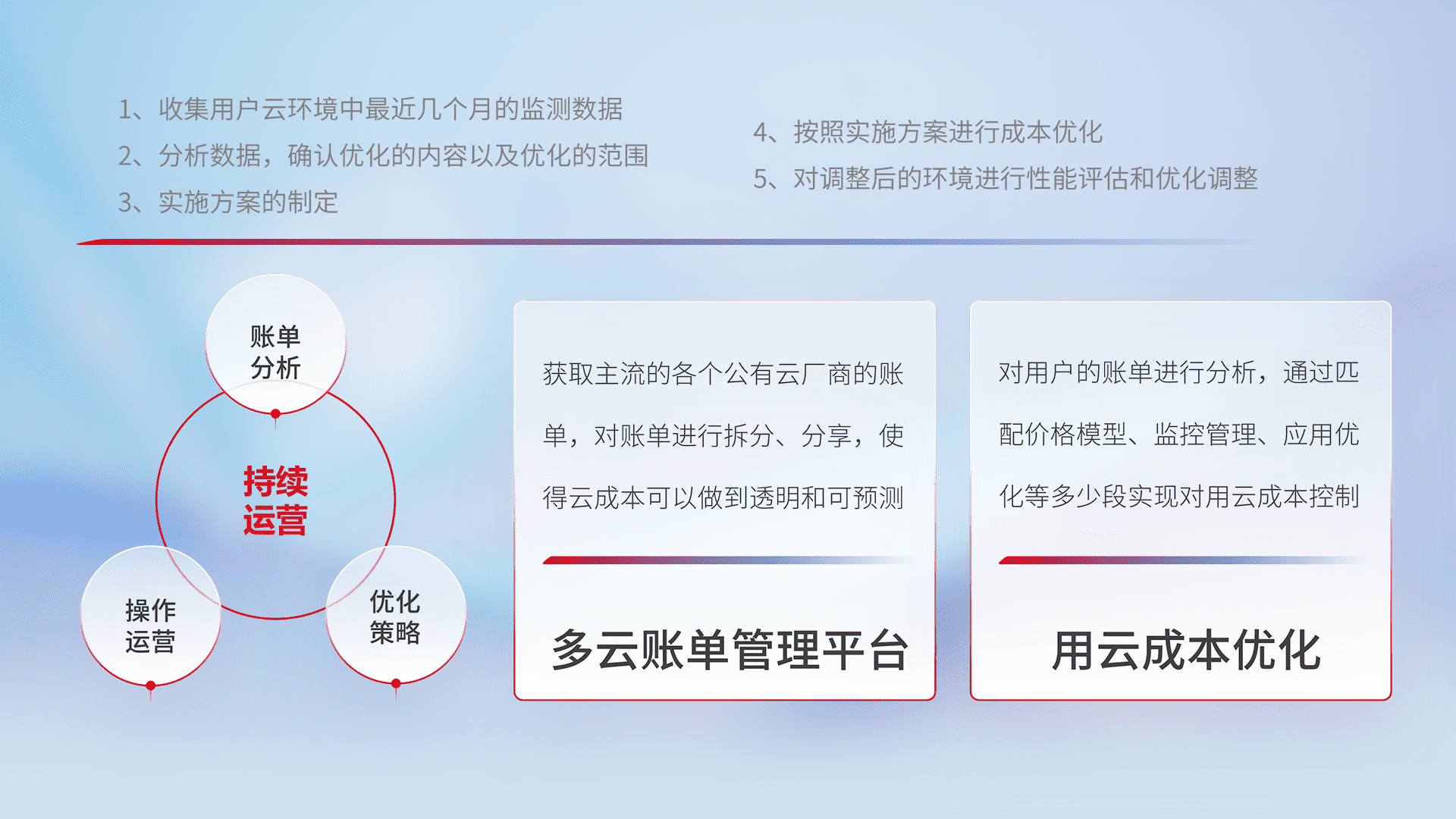 通过多云纳管,,,,以统一的资源数据模型把客户的云资源进行抽象和封装,,,,进而实现对多云资源的统一操作,,,保障云资源管理的可靠性、、稳定性与可用性。。量身定制化运维内容,,,,配置、、、开发运维、、补丁管理、、、、备份、、、监控、、、认证和访问管理、、审计和日常巡检等,,保障在用云过程中的可靠度,,,稳定度以及高可用率。。